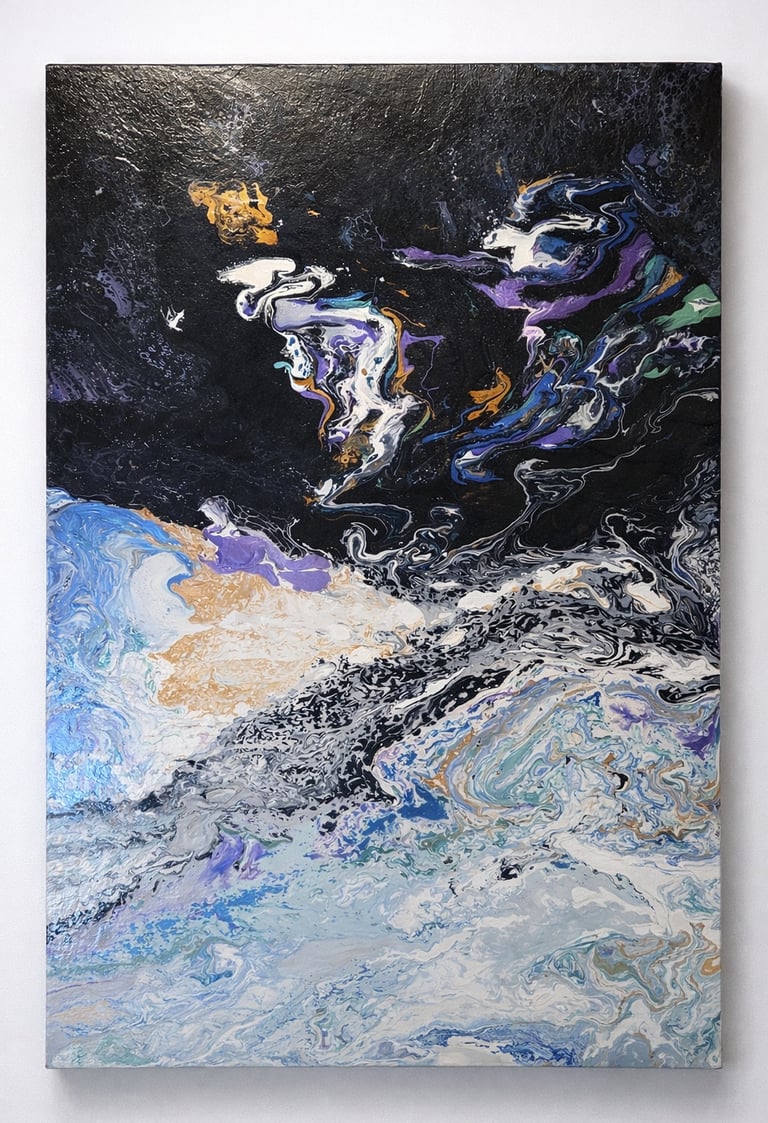 Baron’s practice embraces layered acrylics, metallics, mixed media, and fluid techniques to create immersive surfaces that invite reflection. Many of his works are conceived as contemplative experiences, encouraging viewers to slow their gaze, engage emotionally, and discover personal meaning within the composition.